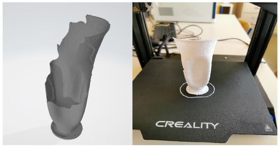 While FDM is an affordable and accessible technology, the surface of objects produced by FDM can sometimes appear rough or uneven. Fortunately, there are several methods available to improve the surface quality of FDM printed models. One method is to use chemical treatments to smooth out the surface of the printed model. Acetone is a commonly used chemical that can be applied to the surface of models made from materials such as ABS or PLA. The acetone vapors dissolve the outer layer of the model, smoothing out any visible lines or imperfections on the surface. Another chemical treatment involves using a mixture of isopropyl alcohol and water, which can have a similar smoothing effect. Thermal treatment is another method used to improve the surface of FDM printed models. This involves heating the surface of the printed model with a flame or heat gun, which melts the outer layer of the model and smooths out any visible imperfections. However, this technique requires care and caution as excessive heat can cause the model to warp or distort [46]. Figure 3 depicts a portable 3D printer, printing the result of the 3D scan depicted in Figure 1, scanning a glass artifact in the Laboratory of Non-Destructive Techniques, University of West Attica, Athens, Greece.