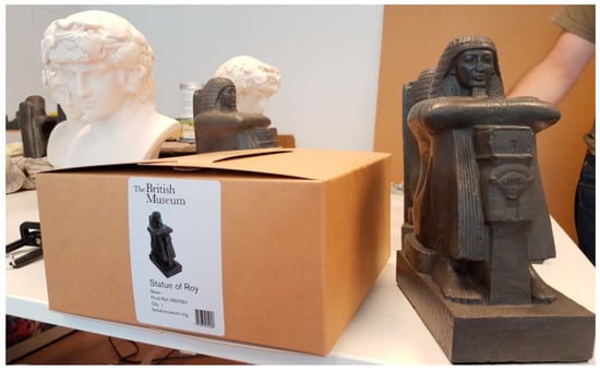 Numerous cases of relevant applications are being documented in published literature. More specific, one such case concerning the British Museum in London used 3D printing to create a replica of the Rosetta Stone, which was made available for public viewing. This allowed visitors to view and interact with the artifact in a tangible way without handling the original, which is fragile and sensitive to light exposure. The British Museum has utilised 3D printing technology as a means of preserving and promoting cultural heritage. The museum has used 3D printing to create detailed replicas of artifacts and artworks, allowing visitors to get a close-up look at these important objects. The technology has also been used to create interactive displays, allowing visitors to see and touch 3D-printed models of objects from the museum’s collection. Additionally, the British Museum has used 3D printing to create research tools, such as replica bones for scientists studying human evolution, and to create educational resources, such as hands-on models for school groups. The British Museum’s use of 3D printing enhances the visitor experience and further assists in promoting cultural heritage. Figure 9 depicts a 3D-printed replica of a part of its collection, derived from a 3D scan [89,90].