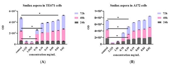 Dose dependent and time dependent effect after treatment with S. aspera extract on TE671 (A) and A172 (B) cells. Data are presented as the mean ± standard error of the mean (SEM) (with n = 8). The asterisk (*) indicates significant differences between untreated and treated cells. The grey color corresponds to 24 h of treatment, the pink to 48 h and the light blue to 72 h.