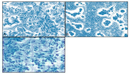 Microscopy inspection of the TE671 rhabdomyosarcoma cells, grown for 72 h in DMEM with no other treatment (A), cells treated with 0.78 mg/mL of the extract (B) and cells treated with 0.39 mg/mL of the extract (C). Images were captured at ×200 magnification.