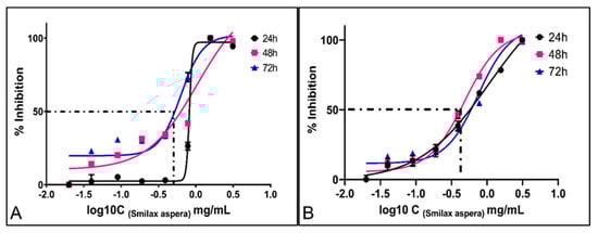 IC50 of S. aspera extract on TE671 cells (A) and A172 cells at 24, 48 and 72 h (B). The lowest IC50 value for TE671 cell line was 0.629 mg/mL, calculated at 72 h and 0.482 mg/mL for A172 cell line, calculated at 48 h. Cancer cell viability increases as concentration of the drug decreases.