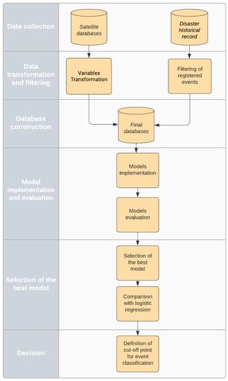 Index insurance indemnifies the policyholder based on the observable value of the predefined index which is highly correlated with losses. There are values or thresholds which define the trigger signal of indemnities. In the context of machine learning, this corresponds to a classification problem, allowing researchers to predict the occurrence of a loss event. In this study, we use historic flood data as a proxy of losses. Particularly, we use two data-driven methodologies to model the relationship between the loss occurrences with weather indices. The purpose of these models is to determine the occurrence of flood events based solely on the selected weather indices values. The time period used to train the models extends from 3 June 2000 to 31 December 2021. The starting date was selected due to the historical availability of the GPM time series (Table 1), while the end date was selected due to the lack of availability of data in the flood record database.