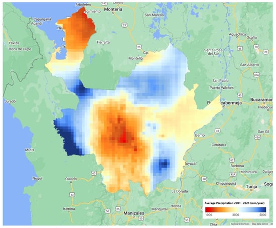 Precipitation values in Antioquia Department, Colombia by the Climate Hazards Group InfraRed Precipitation with Station data (CHIRPS).