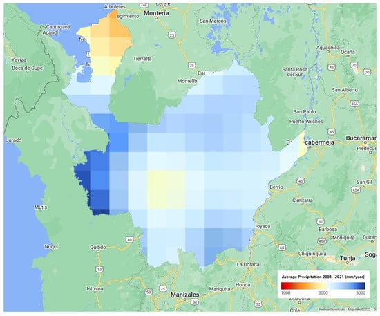 Based on the criteria, and restricting the search to databases available in the Google Earth engine, three precipitation databases and a database with a surface run-off variable, and four soil moisture levels were selected. The use of multiple databases allows researchers to improve the ability of the models in capturing extreme events [24]. The selected datasets for precipitation came from Climate Hazards Group InfraRed Precipitation with Station data (CHIRPS), Precipitation Estimation From Remotely Sensed Information Using Artificial Neural Networks-Climate Data Record (PERSIANN-CDR), and Global Precipitation Measurement (GPM) (Figure 4, Figure 5 and Figure 6). The CHIRPS data (Figure 4) shows the most extreme differences in precipitation levels. The central and north regions present lowest values (1000 mm per year). In the other hand, the east and southeast regions present the highest precipitation levels (5000 mm per year). The PERSIANN (Figure 5) and GPM (Figure 6) figures show the same configuration of precipitation values, but with different resolutions.
