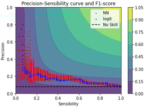 Figure 7 shows the performance of the best 27 configurations in the precision-recall space, which also includes level curves corresponding to the F1 score. The precision–sensitivity curve allows each model to be evaluated for the whole range of cut-off probabilities. The perfect model resides in the upper right corner, with a precision and sensitivity of 1. Based on this result, the performance of the best models is far from the optimal model and closer to the baseline model.
