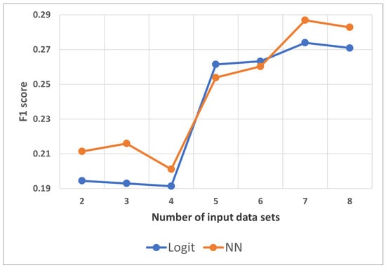Figure 8 compares the F1 score evaluated in the test data for an increasing number of input datasets. Neural network results were averaged for three iterations, due to the stochastic component related to model training.