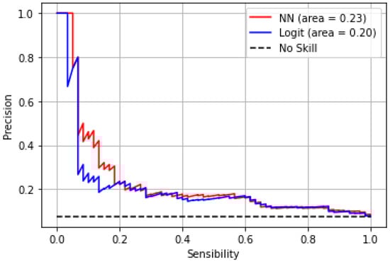 The curve “receiving operator characteristic” or ROC, is a chart that uses the rate of true positives (sensibility) against the rate of false positives (1-specificity) for the range of probabilities. A perfect model would have a specificity and sensibility of 100% for all the probability ranges, and the area under the curve (AUC) ROC would be 1. On the other hand, there is the PS curve, which is obtained by plotting precision against sensibility. In this case, the AUC could be used to measure the model’s performance [28].