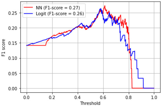 Figure 10 shows the F1 score for the range of cut-off probabilities. The neural network model achieves a higher F1 score than the linear model for almost the entire probability range. The curve related to the machine learning model is generally above the curve of the linear model, which indicates that it generally performs better for the range of cut-off probabilities. On the other hand, similar models [24] achieve higher performance metrics for the F1 score and AUC score. However, the methodology presented here supports the idea that machine learning methodologies perform better than logistic regression which represents a traditional classification framework.