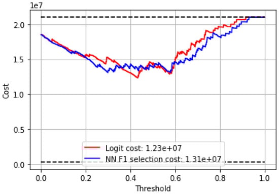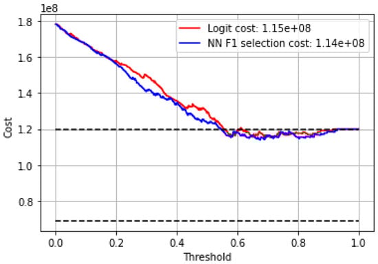 As mentioned earlier, a hypothetical utility measure is computed for both parties (policyholder and insurance provider), which could be used to derive the optimal cut-off point and compare the costs related to each model. Therefore, we followed the procedure mentioned in Section 5 First, the various costs associated with the parametric model must be defined. The following parameters are used: = $1,000,000; = $2,000,000; m = 1.15; = $5000; = $20,000; = $350,000. Figure 11 and Figure 12 show the average cost associated with the best model selected using the F1 score, comparing its performance with the cost associated with a linear model. Results show that the curves associated with neural network models have lower costs than the logistic regression model for almost the entire range of probabilities. As for the insurer, the logistic regression model achieves the lowest cost. However, the neural network models generally present lower costs for almost the entire range of probabilities.