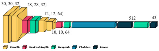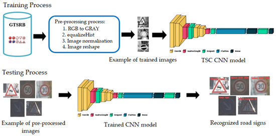 The classification process consists of two steps, which are training and testing, as shown in Figure 6. In the training process, the images are first preprocessed to feed the deep neural Traffic Sign CNN model later. Once the model is trained after several epochs, the testing step takes place using test images to evaluate the developed CNN model. The CNN model is displayed in the figure below.