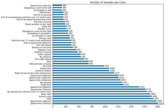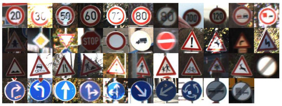 - Size: this dataset involves 43 road sign classes as described in Figure 7 [44], with 51,839 images (34,799, 4410, and 12,640 for training, validation, and testing, respectively) collected from real-world traffic scenes in Germany;