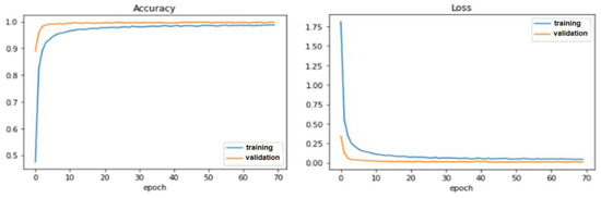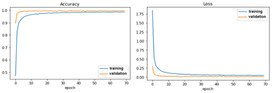 Training, validation, and testing accuracy rates reach, respectively, 99.35%, 99.31%, and 99.27%. These results, as shown in Table 11, are considered interesting in addition to those found previously with the GTSRB dataset, which confirms the robustness of our developed TSR system.