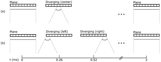 The simplest sequence would have alternating plane waves and diverging waves that repeat at the chosen repetition frequency. An improved sequence would use two diverging waves, one from either end of the array, with the plane wave. This extends the effective transmit aperture for the SSA image by an entire transducer length (half in each direction at the ends of the sweep). This diagram shows the timing used in this paper with 260 s between pulses within the sequence and an overall frame rate of 500 Hz. While, in these diagrams, the diverging wave is shown produced by a single element, it is also possible to use subapertures to create diverging virtual sources [29] with an improved signal-to-noise ratio (SNR).