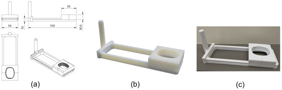Mechanical slide fixture allowing 1-D movement along the array dimension. (a) Dimensioned diagram (units mm). (b) Rendering. (c) 3-D printed device.