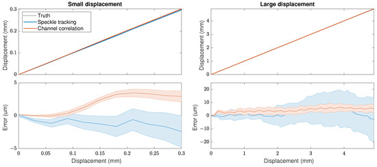 Lateral displacement estimation was first investigated using the two proposed techniques—speckle tracking and channel correlation—in simulation. Figure 5 explores the error in estimation faced over varying displacement distances using individual pairs of frames (i.e., no multi-lag estimation). Over short distance scales, up to the element pitch, the two methods demonstrate different behaviors. Speckle tracking (lateral pixel spacing mm) shows an oscillating error possibly related to the acoustic resolution, pixel spacing and the subsample estimation method chosen (iterative reconstruction). It is expected that this behavior could change for varying choices of these parameters. Channel correlation shows a much smoother performance because the channel spacing is much coarser (0.3 mm) and the estimate does not use focused signals. However, it should be noted that, in both cases, the error is limited to less than 5 m or .