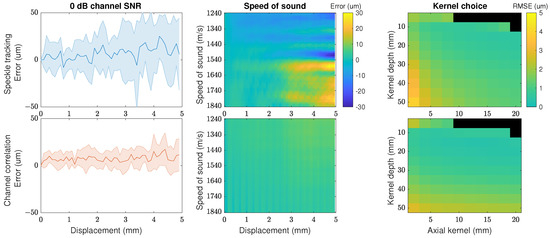 Challenges that these methods may face in practice, such as noise and sound speed error, were then studied and the best estimation parameters to use determined with the results shown in Figure 6. First, the impact of bandlimited additive Gaussian noise on the estimation was explored. Reducing the channel SNR to 0 dB (measured at the same depth used for displacement estimation) resulted in additional variance in the estimates compared to what was seen in Figure 5, but the estimates remain reasonably unbiased and show standard deviation less than 50 m over the 5 mm distance. Second, error to the speed of sound used in estimation (including image formation for speckle tracking) was introduced, varying it from 1240 to 1840 m/s compared to the correct 1540 m/s.