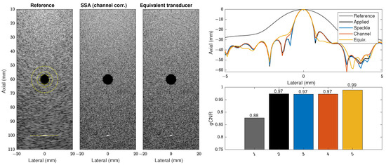 Simulation comparison of reference image, SSA images and equivalent transducer matched to the effective length of the SSA acquisition. (Left) Images for reference, channel correlation estimated SSA and equivalent transducer, shown with a 50 dB dynamic range and ROIs indicated for the lesion and point. (Right top) Lateral PSF for point at 10 cm depth. (Right bottom) gCNR for anechoic lesion target located at 6 cm depth.