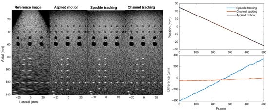 The application of the two estimation techniques to SSA imaging in a series of phantom experiments was investigated. Figure 8 shows the initial experiment comparing the estimates to a known motion as applied by a translation stage. Both methods were able to accurately reproduce the applied motion profile over a span of 50 mm with maximum error for the speckle tracking method around 400 m and for the channel correlation method under 50 m. Interestingly, the estimate for channel correlation is biased, not showing the usual linear trend across the sweep. This may be due to the fixed step size creating the same slightly biased error on each step according to the subsample estimation strategy, meaning it would not be seen in freehand sweeps with varying step sizes.