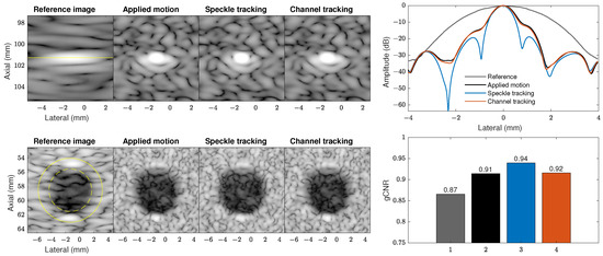 (Top) Point target images corresponding to the central point target at depth 100 mm from Figure 8. Yellow line indicates the depth for the lateral PSF. (Bottom) Lesion target images corresponding to the central large lesion target at depth 60 mm from Figure 8. Yellow circles indicate ROIs inside the dashed circle and outside the solid circle for gCNR calculation. All images show a 50 dB dynamic range. Both metrics show comparable performance for the two motion tracking techniques and similar performance to the applied motion case with slight improvements using speckle tracking.