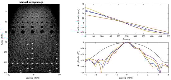 Results of four manual sweeps using linear slide fixture. (Left) Sample SSA image from one manual sweep using channel correlation estimate (50 dB dynamic range). (Right top) Motion estimates showing variation in sweep extent and temporal profile of manual sweeps. (Right bottom) Lateral PSF for manual sweeps showing consistent results with slight variations due to phantom position and sweep extent. Reference PSF from Figure 8 shown in black.