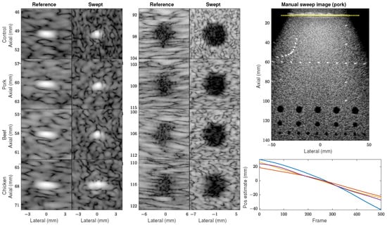 - The manual sweep was repeated with an ex vivo tissue sample between the transducer and an ATS 539 phantom. The phantom was positioned so that lesion targets were located below point targets, and both were visible in the image. Three different store-bought meats were used to study whether the intervening layer affected motion tracking. Pork chop (12 mm thick), beef loin (10 mm thick) and chicken breast (9–19 mm thick) were used as varying models. Samples were prepared to be wider than the slide device so that they rested entirely on top of the sample. The degassed samples were placed on top of plastic wrap, and all layers were coupled with gel. The same sweep sequence was used as above.