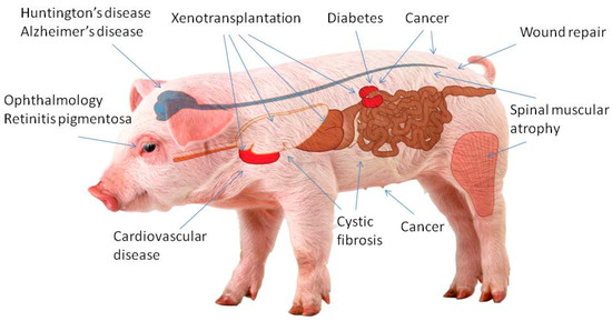 Animal-based disease modeling has become an interest in biomedical research, including cancer, metabolic, cardiovascular, and neurological disorders [1,2,3,4,5]. Swine has been an interest for basic and applied biomedical research for more than 20 years [6,7,8]. Swine plays an essential roles as a model of human diseases (Figure 1), including cardiovascular disease, cancer, diabetes, toxicology, and lipoprotein metabolism as a model organism [9,10,11,12]. The first generation of a pig using the somatic cell nuclear transfer (SCNT) method was conducted in 2000 [13,14,15], and since this time many genetically modified cloned pigs have been generated [16,17,18]. Despite the success in generating of cloned individuals, there are still limitations that need to be improved to increase the efficiency of the porcine SCNT technique.