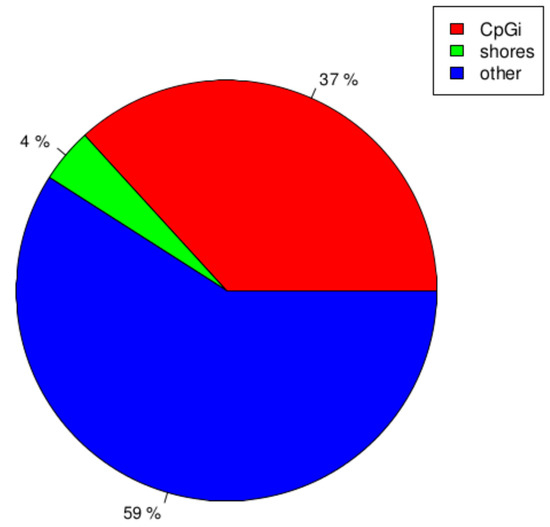 We mapped the global DNA methylation patterns of adult male ADMSCs showing high and low efficiency of SCNT in pigs. We identified 3704 bases with statistically significant differences in methylation (Supplementary Table S2); 890 bases within 5 kb of a known transcript (Supplementary Table S3); 10,062 tiles with statistically significant differences in methylation (Supplementary Table S4); and 4965 tiles within 5 kb of a known transcript (Supplementary Table S5). The majority of differentially methylated sites were intergenic Figure 2, and 37% are located in known CpG islands, Figure 3.