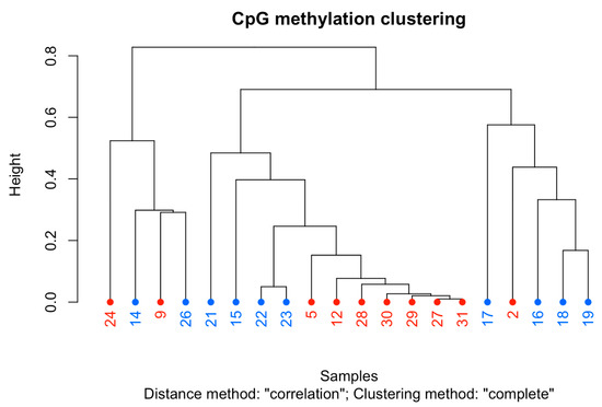 Hierarchical cluster analysis according to methylation patterns across analysed samples. Blue colour—low cloning efficiency cells; red colour—high cloning efficiency cells. Dendrograms were produced using correlation distance and ward clustering methods. Numbers represent the individual sample ID.