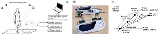 As shown in Figure 2a, the equipment used in this experiment is a UWB system, comprising UWB sensors attached to each shoe to measure the distance (collected on a personal computer (PC)), an MCS that measured the location data of the reflection marker attached to the shoe, and a device that synchronized the data of the two systems.