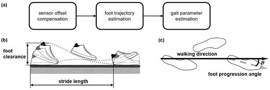 Gait analysis and its parameters: (a) Flowchart of the gait parameter estimation algorithm; (b) Gait parameters: foot clearance and stride length; (c) Gait parameter: foot progression angle.