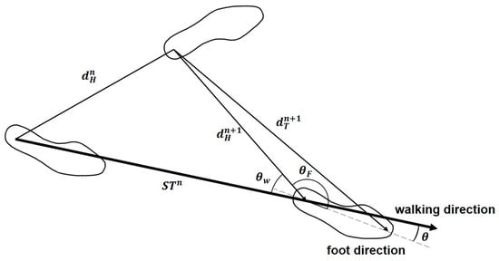 The FPA is calculated as the sum of the angle between the foot direction vector and vector and the walking direction vector, which can be obtained from the coordinates of the start and end points of the swing (Figure 4), and vector. This is calculated as follows: