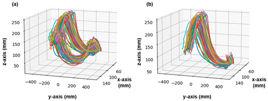 Figure 6 shows the UWB data acquired from participant #3 of the gait experiment and the 3D trajectory of the right foot determined using Equations (8)–(10). The foot trajectory estimated using UWB is shown in Figure 6a. Here, a closed curve is drawn using the combined trajectory of the foot when the tag is in the swing and stance phases. Herein, after the heel strike point, when the foot is in a swing state and higher than the opposite foot, the z-direction location value reverses as the opposite foot lifts from the ground. Therefore, the foot’s trajectory at a wholesome swing phase could be illustrated only if the data with the z value of the anchor of the opposite foot is higher than the z value data of the tag location installed on the stepping foot in the stance phase. This is illustrated in Figure 6b.