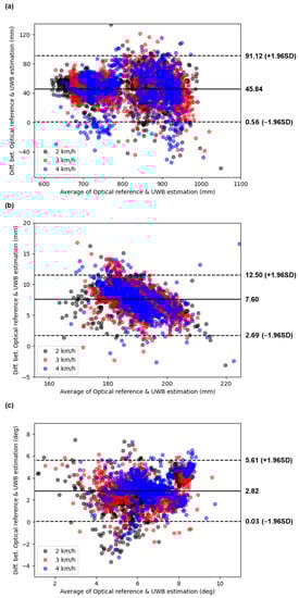 Figure 7 shows the Bland–Altman plot that assesses SL, FC, and FPA using the 3D trajectory data of the foot during the swing phase. It shows the data acquired from all participants. The x-axis represents the average of the values measured by the MSC (or optical reference) and the UWB system, and the y-axis represents the difference between the two measured values (MCS (or optical reference)—UWB).