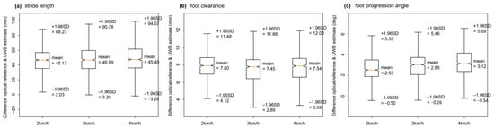 Bland–Altman graphs for gait parameter values determined using UWB and motion capture system: (a) Stride length; (b) Foot clearance; (c) Foot progression angle.