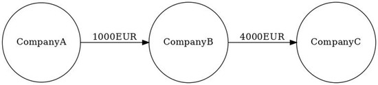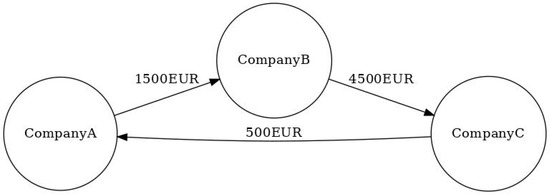 Suppose there are three companies, as shown in Figure 1. In this case, company A has a debt (e.g., an invoice) of 1500 EUR with company B, which in the graph is represented by an arrow directed from company A to company B, where the weight is the amount owed (1500 EUR). Likewise, company B has a debt with company C of 4500 EUR and a debt of 500 EUR with company A. As can be seen, this creates a debt cycle where multiple companies owe each other; therefore, a cancelation worth 500 EUR can be established. As mentioned earlier, cancelation cycles are always applied for the lower amount. After compensation, we obtain the new graph shown in Figure 2.