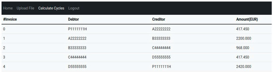This is important since the algorithm must take into consideration the due date of the invoice. Thus, only past due invoices with respect to the date provided by the user are considered. Let us remark that this tool was conceived with business consultancies in mind as they can receive succulent fees for advising debt compensation to their customers. Thus, the tool was developed in collaboration with the company IPI: Conocimiento y Flexibilidad. Once the input data are obtained, normally an Excel or text file, they are anonymized for privacy issues. This task is performed through bash scripts. When this process ends, our algorithm is executed to obtain the debt cycles in the graph (see Figure 6). The output is a text file with the current cycles, as well as the amount of debt that can be compensated. This text file is shown in the tool as HTML tables so that the user can check different cycles and make decisions accordingly (see also Figure 11).