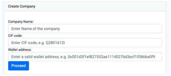 In Figure 7, we show the input fields for company creation. As can be seen, participants must provide their name, CIF, and Ethereum address. CIF is the Spanish VAT number of a company, which allows it to be identified for taxation.