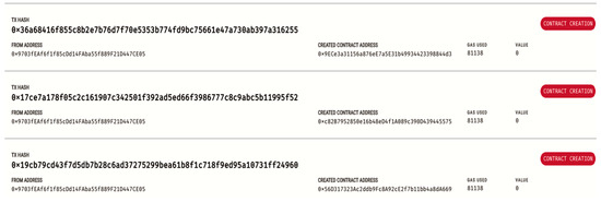 Let us remark that we did not publish to the main net of Ethereum due to current high gas fees (see Figure 3, where ~50 EUR was the total gas fee at the time of writing); however, it is part of Ethereum’s roadmap to reduce these fees to make them more affordable for everyone. This cost is high if one considers that a small case study was conducted. In contrast, we used a well-known framework to simulate the Ethereum virtual machine (EVM). Truffle [19] is a world-renowned environment to develop, test, and deploy decentralized applications. It acts as a pipeline for code using the Ethereum virtual machine, with the aim of making a developer’s life easier. In Truffle, one can find the following: