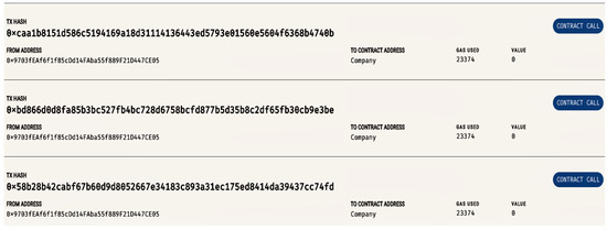Once this information is provided, after clicking “proceed”, an instance of a Solidity smart contract named “company” is created, and the corresponding transaction is deployed in the chain (see Figure 8).