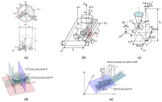 In Equation (1), M is the transformation matrix from the cutter–tooth coordinate system to the workpiece coordinate system, the M1~M3 is the translation matrix of the tool tooth coordinate system to the coordinate system of the workpiece, and the T1~T5 is the rotating matrix from the tool tooth coordinate to the coordinate system of the workpiece.