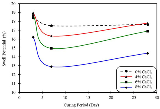 The swell potential of clay treated with CaCl2 (2% cement added) at different curing times.