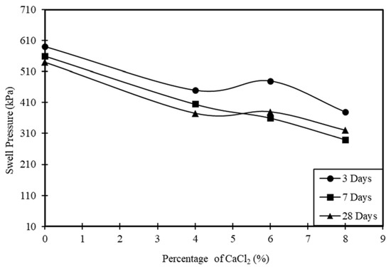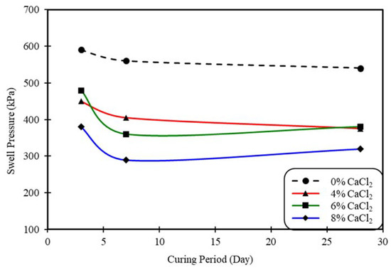 Reduction in the swelling pressure by 37.4% and 28% was observed in the clay samples cured for 28 days for clay including calcium chloride and cement at 8% and 4%, respectively (Figure 3 and Figure 4).