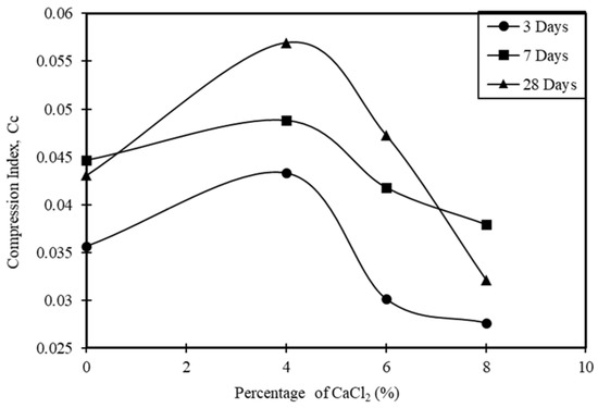 The compression index estimated at a stress of 200 kN/m2 was investigated for Al-Qatif clay treated with 4%, 6%, and 8% calcium chloride and 2% cement. The compression index is decreased with the increase in the calcium chloride content. This result indicated that a higher strength is observed for the clay due to the cement and calcium chloride (Figure 5 and Figure 6). It is worth noting that when adding an accelerator or a retarder to a cement mixture, the time to develop the strength may not be uniform and depends on the hydration taking place in the mixture.