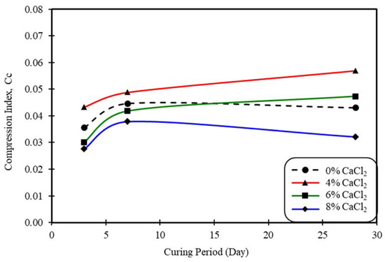 The compression index of the clay treated with CaCl2 (2% cement added) at different curing times.
