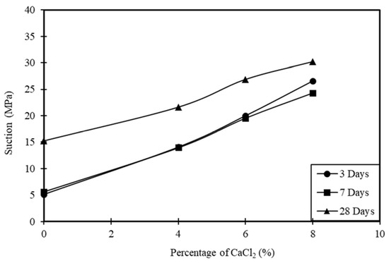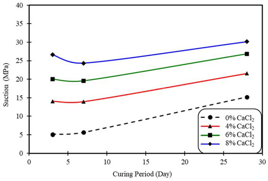 Increased suction is developed by the addition of calcium chloride, and suction is directly proportional to the percentage of the added calcium chloride (Figure 7 and Figure 8). Generally, a high suction is associated with high swelling clays, but the increases in suction do not necessarily cause more swelling. This is due to the addition of cementing agents, which maintain strong particle-to-particle bonds [11]. The expansion will be arrested even at a high suction pressure. In some cases, a sulfate heave was reported to take place in clays rich in sulfate and sulfide (>3000 ppm) by the stabilization of clays using calcium-based additives [11,37].