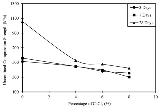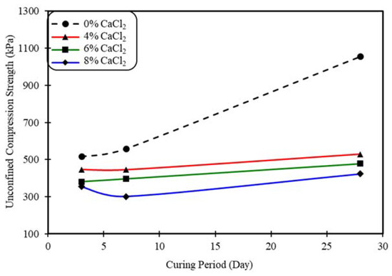 From the investigation of the compressive strength and the stress–strain behavior, the unconfined compressive strength is slightly reduced by the addition of a high content of calcium chloride. The loss of strength is expected because calcium chloride is a soluble salt and can slowly dissolve in water. As a result, voids can form within the soil mass, which can provide room for the soil to swell, and this phenomenon is reflected as an overall reduction in the heave. The slight reduction in strength is not a serious issue compared to swelling and expansion. With cement, only the strength of the clay was increased, and it reached its maximum at a curing period of 28 days, but with the addition of calcium chloride, the compressive strength was lower (Figure 9 and Figure 10). The influence of 7- and 28-day curing periods on the stress versus axial strain is shown in Figure 11 and Figure 12.