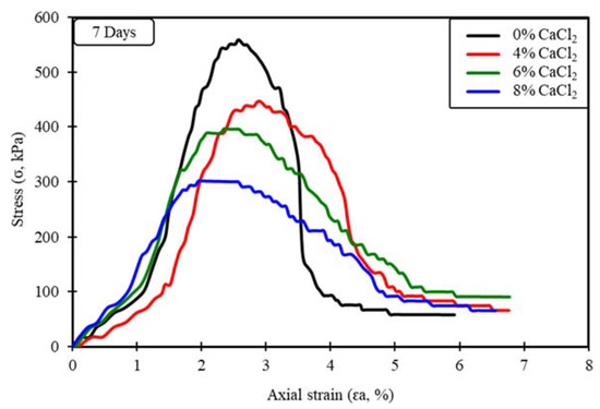 Stress versus axial strain at a curing period of 7 days.