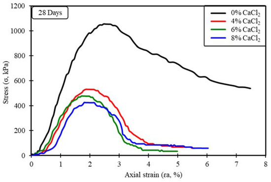 Stress versus axial strain at a curing period of 28 days.