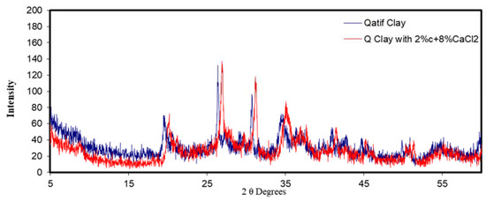 The XRD profile for Al-Qatif natural clay compared with the addition of 2% cement and 8% CaCl2.