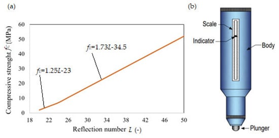 The approximate strength fc was taken as equal to the value of fL. For the obtained reflection number (L), the compressive strength value was calculated from Equations (1) and (2) based on the base curve (Figure 1a):